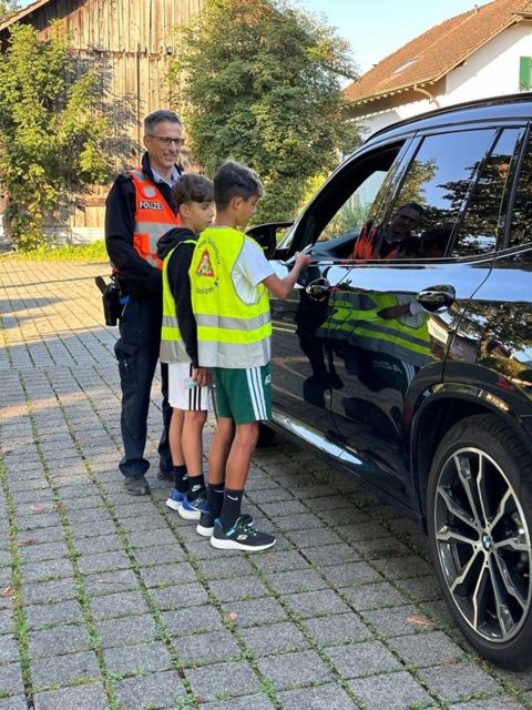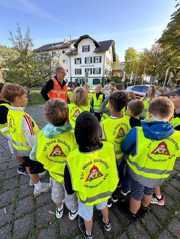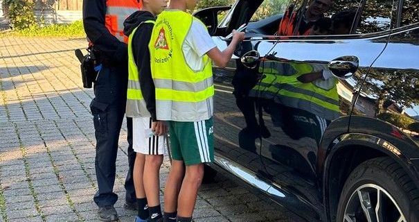 Zum Schulstart am Montag, 25.8, fand vor dem Restaurant Hirschen eine besondere Verkehrssicherheitsaktion statt. Bereits um 7:20 Uhr versammelten sich die Schülerinnen und Schüler der 5. Klasse, um gemeinsam mit der Polizei ein Zeichen für mehr Rücksicht im Straßenverkehr zu setzen.