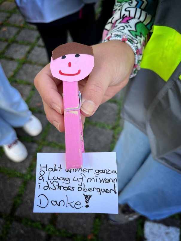 Unterstützt von der Gemeindepolizei wurden vorbeifahrende Autos angehalten und die Fahrerinnen und Fahrer über den Hintergrund der Aktion aufgeklärt. Die Schülerinnen und Schüler überreichten dabei über 200 selbstgebastelte Geschenke sowie einem freundlichen Hinweis zur Aufmerksamkeit im Straßenverkehr: