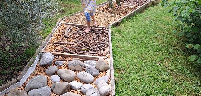 Besonders spannend ist es natürlich, mit geschlossenen Augen über die verschiedenen Materialien zu laufen und sich ganz auf das „Spüren“ der Füsse zu verlassen.