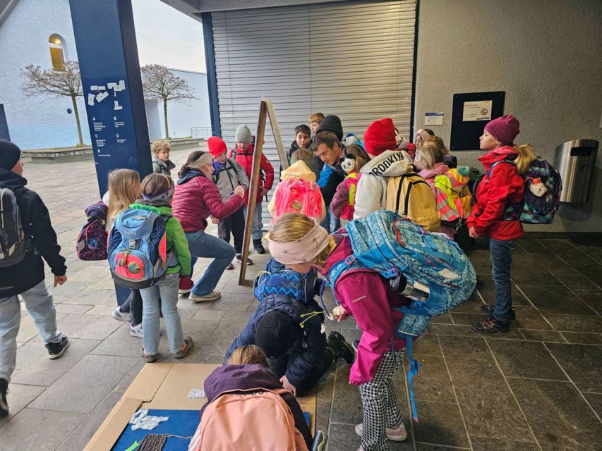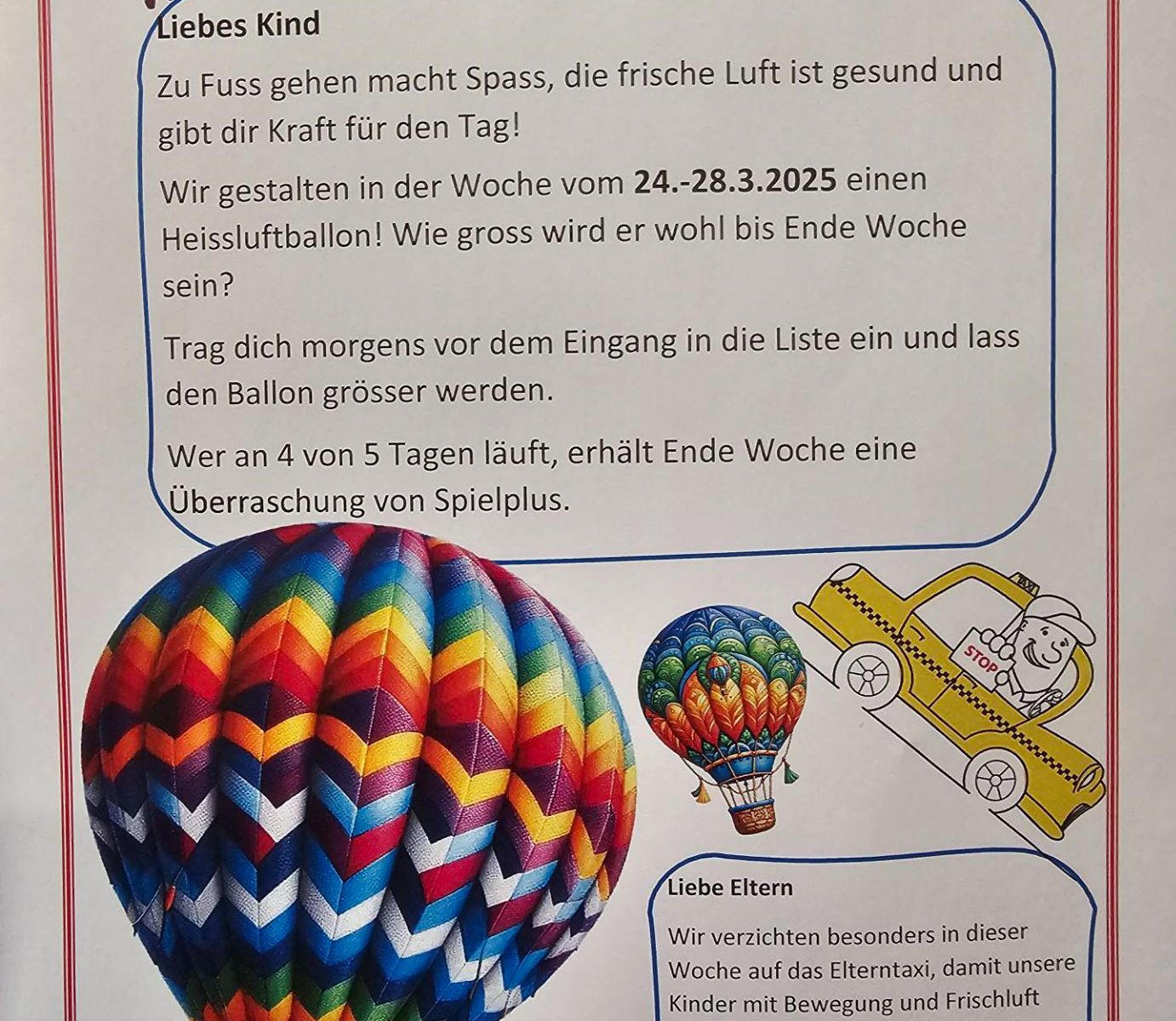 Es wird bewusst diese Woche auf Elterntaxis verzichtet und die Kinder motiviert, den Schulweg zu Fuss zu gehen.