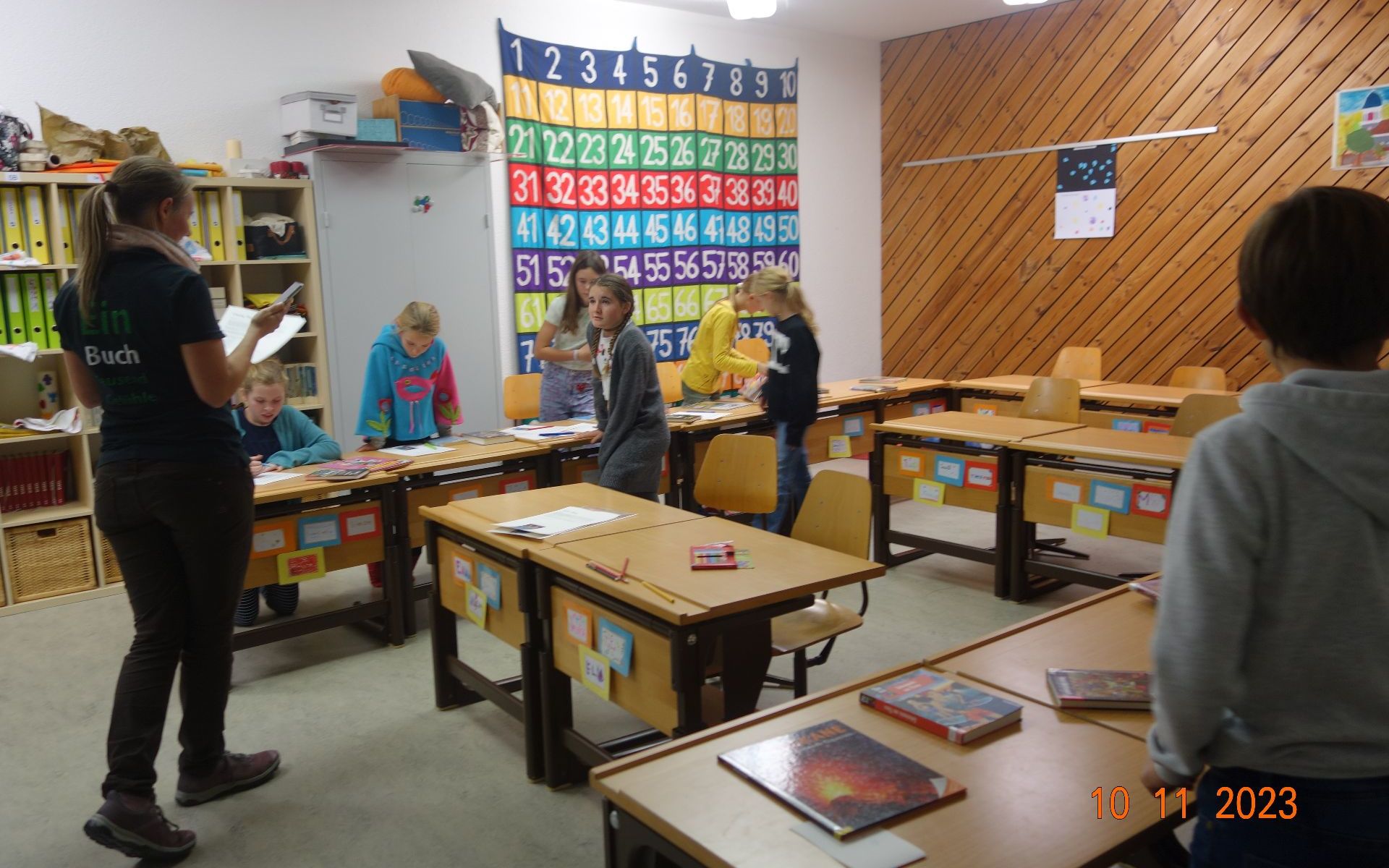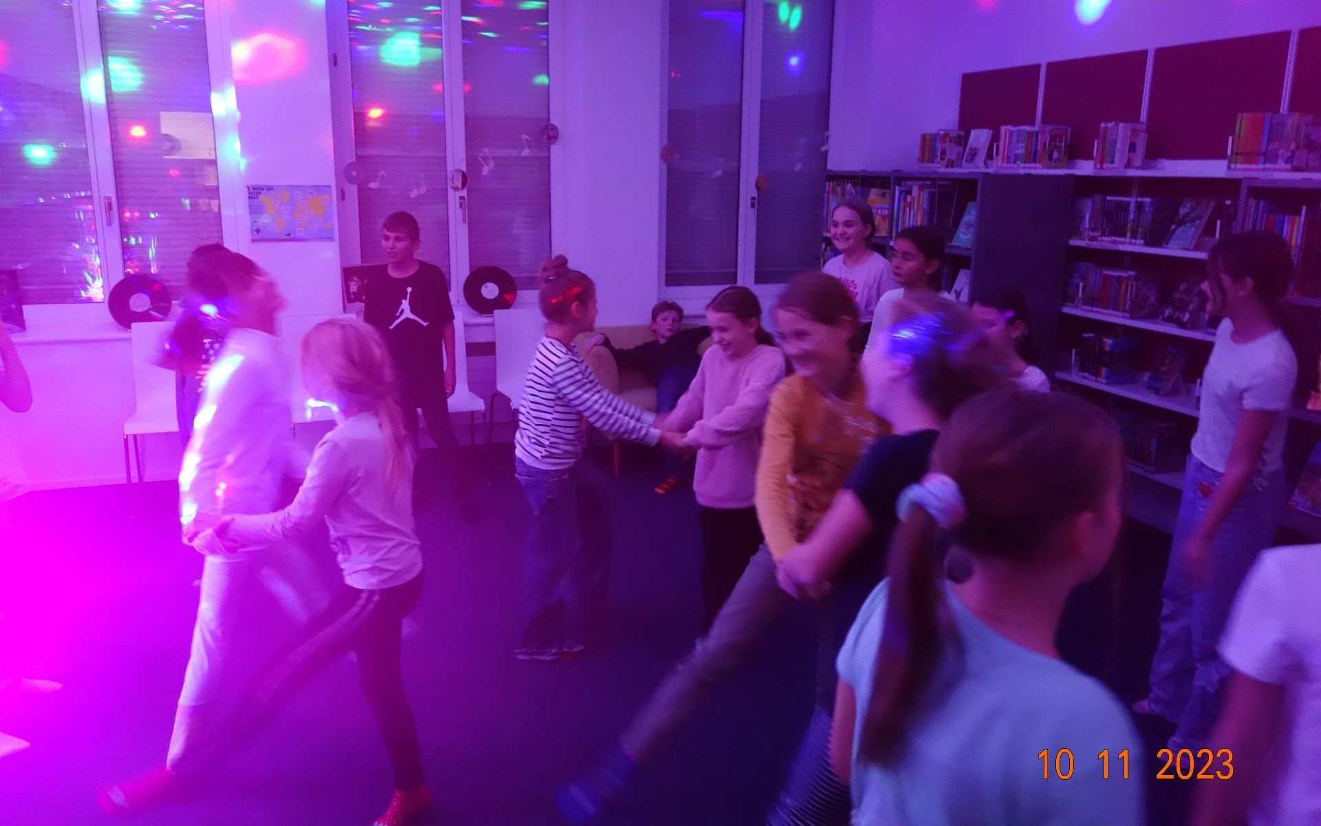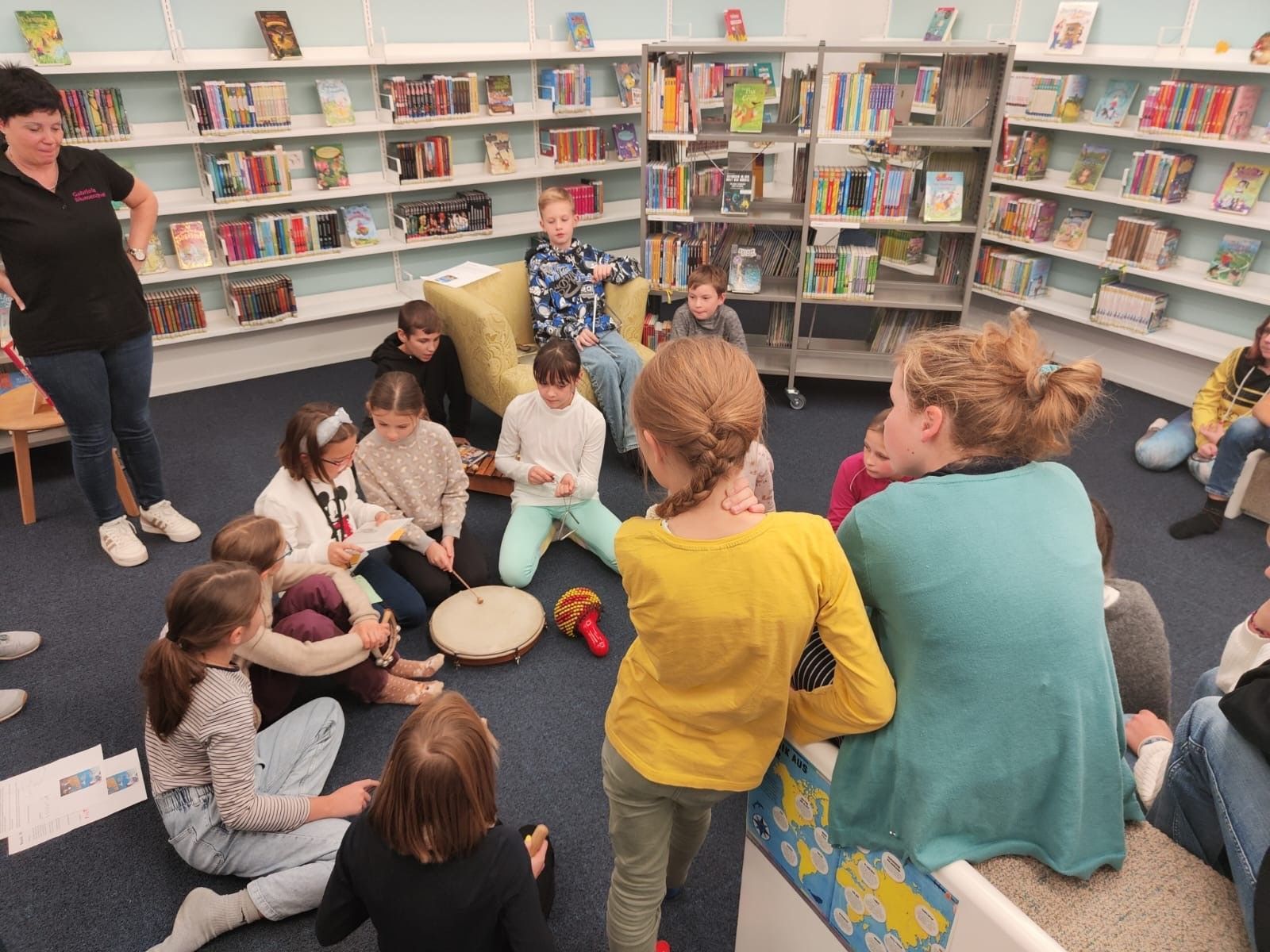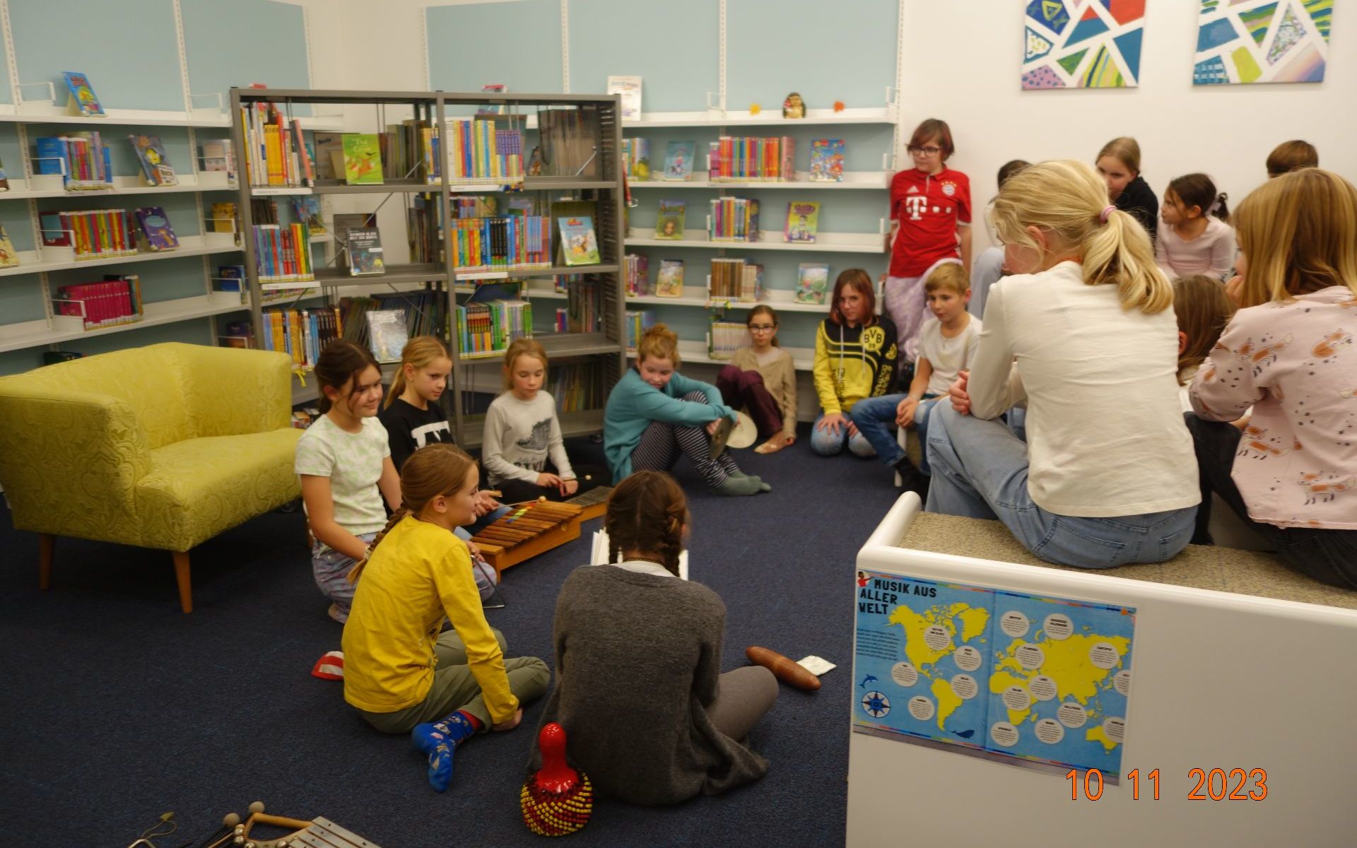 Unter dem Motto "Viva la Musica" öffnete die Bibliothek am 10.11.2023 abends ihre Türe. Es wurde vorgelesen, mit Instrumenten eine Geschichte musikalisch untermalt und anhand eines Liedes das passende Buch gesucht. Zum Abschluss wurde in der Kinderdisco getanzt und Bowle getrunken.